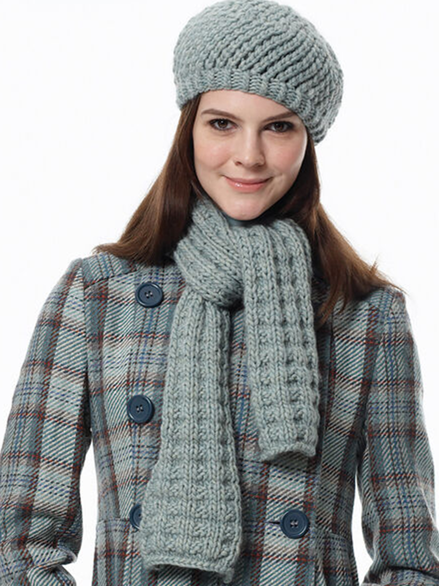 Imagining the coming cold isn’t so bad when you have this stylish ensemble to look forward to. Bernat Roving is your muse to complete a gorgeous set that finishes soft and thick for even the coldest day. Keep warm.