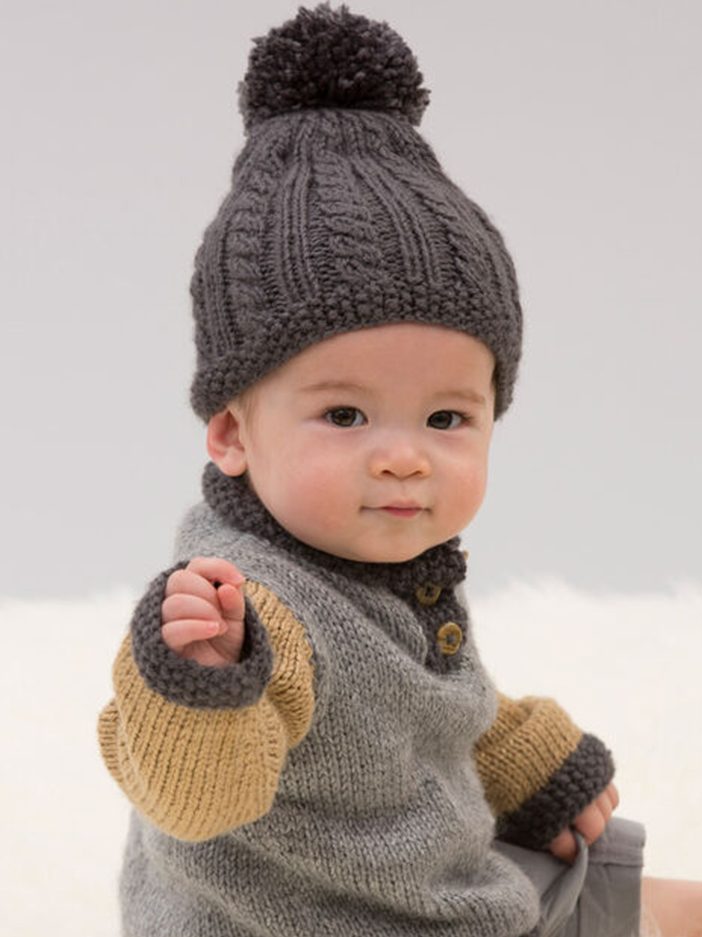 Go beyond pink and blue with this knit sweater and hat set for baby! Featuring cozy neutrals in Red Heart Soft, hat is cabled for added warmth, while the sweater features contrast sleeves, seed stitch placket and edgings for style. We love it in the versatile color palette designed, but it would look just as adorable in any color combination. It’s a must-have set for any well-dressed baby!