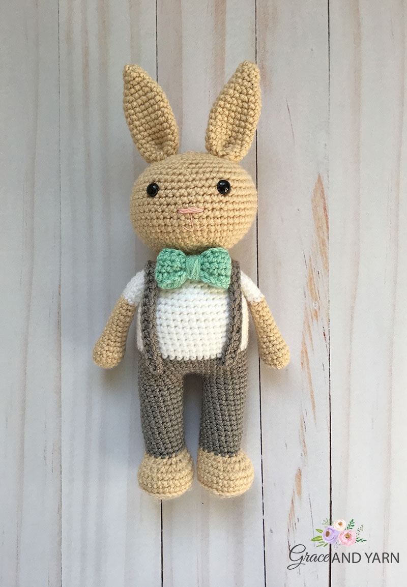 Size 4 worsted weight yarn (I used 75g of Vanna’s Choice yarn in Beige, you will also need a small amount of yarn for the pants/suspenders, shirt and bow)