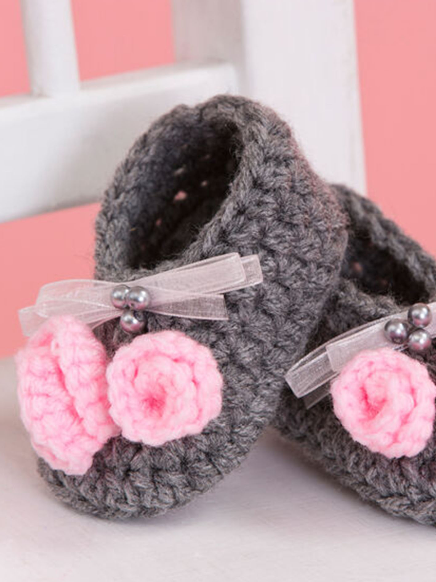 Crochet booties like these make a wonderful gift that will be enjoyed by baby and treasured by mom and dad as baby grows up. Stitched in gentle shades of Red Heart Super Saver, they’re trimmed with pretty pearl beads and sheer ribbon for the perfect accessory worn by the well-dressed little lady! It’s a sweet project that’s as heartwarming to make as it is to give.
