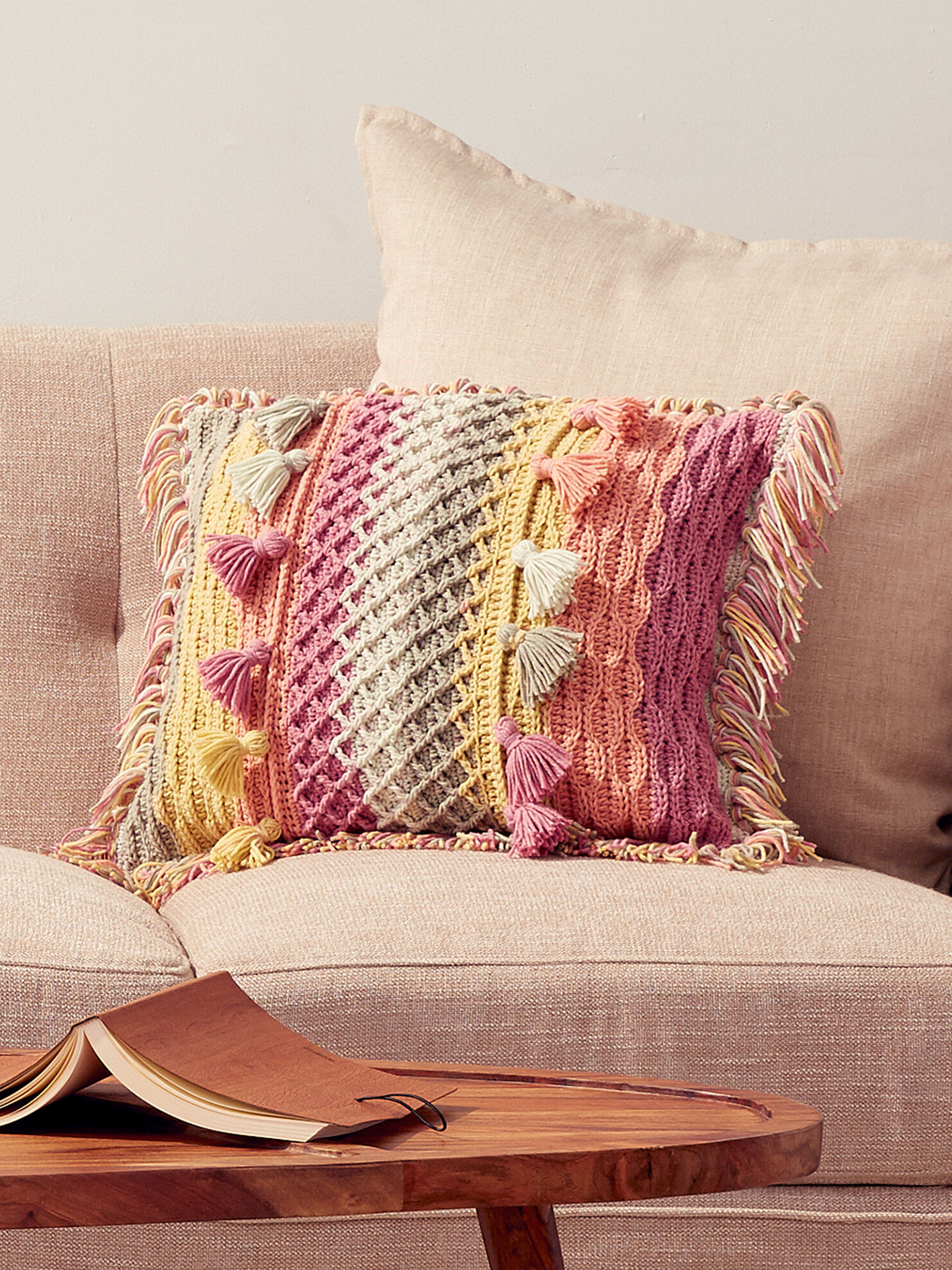 There’s no shortage of excitement with this wonderful crochet pillow! This project is made using a combination of textural crochet stitches, and then accented with trendy tassels and fringe. The beautiful colors of Caron Cotton Cakes are perfect for this fun addition to your home. Explore this great pattern for some techniques that may be new to you!