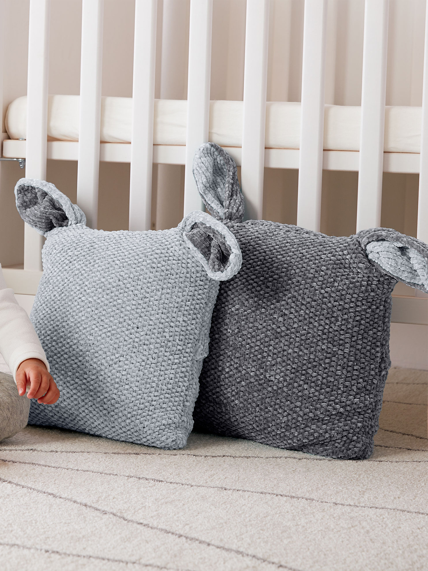 Add a touch of whimsy to a baby’s room with this simple bunny pillow. The main body is worked in seed stitch (knit and purl), while the adorable ears are worked using simple decreases with a cute i-cord edging, transforming a basic pillow into something oh-so-cute and cozy! Bernat Baby Velvet makes it a plush little accessory that’s a joy to complete.