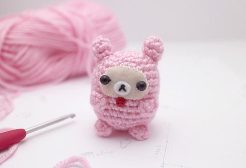 This is an amigurumi pattern inspired by a little kawaii. Korilakkuma in a pink bunny costume! Or if you brown the face, you can get Rilakkuma in a bunny costume. I call it rillabun.