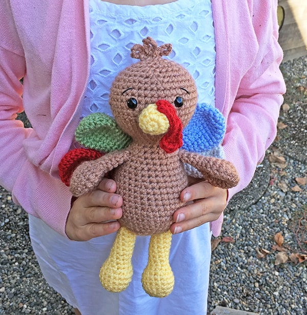 Size 4 worsted weight yarn (50g of brown; small amount of yellow for the legs and beak, red for the wattle, and your choice of colors for the 4 feathers)