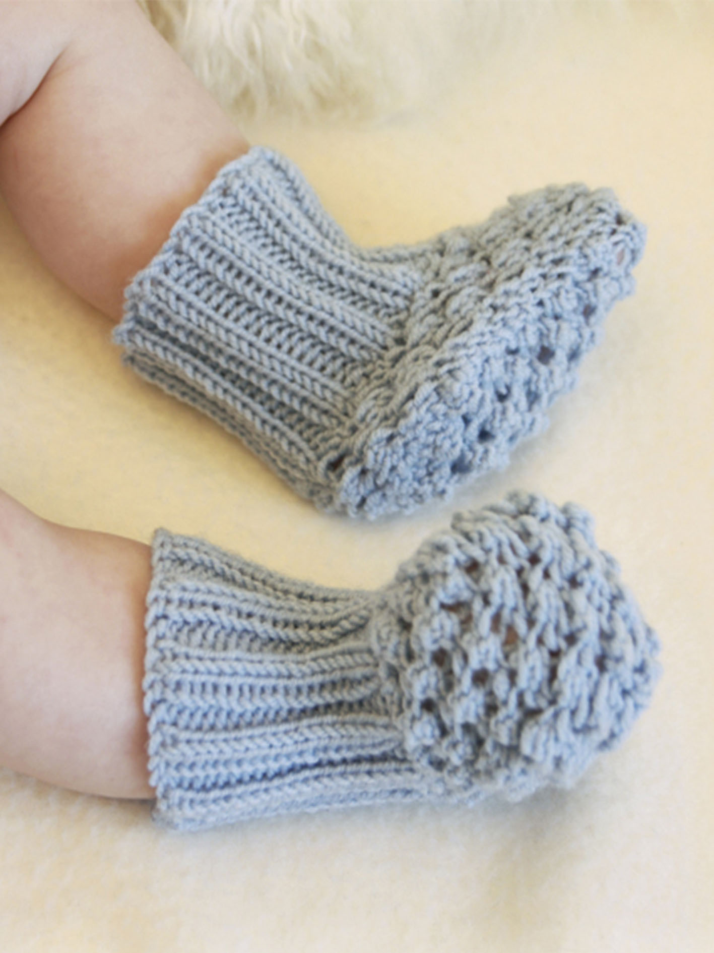 This pattern has multiple variations on a simple baby-sized ankle bootie. With a leather accent bottom and bow, it’s a sturdy enough option that a toddler can wear these to walk in around the house!