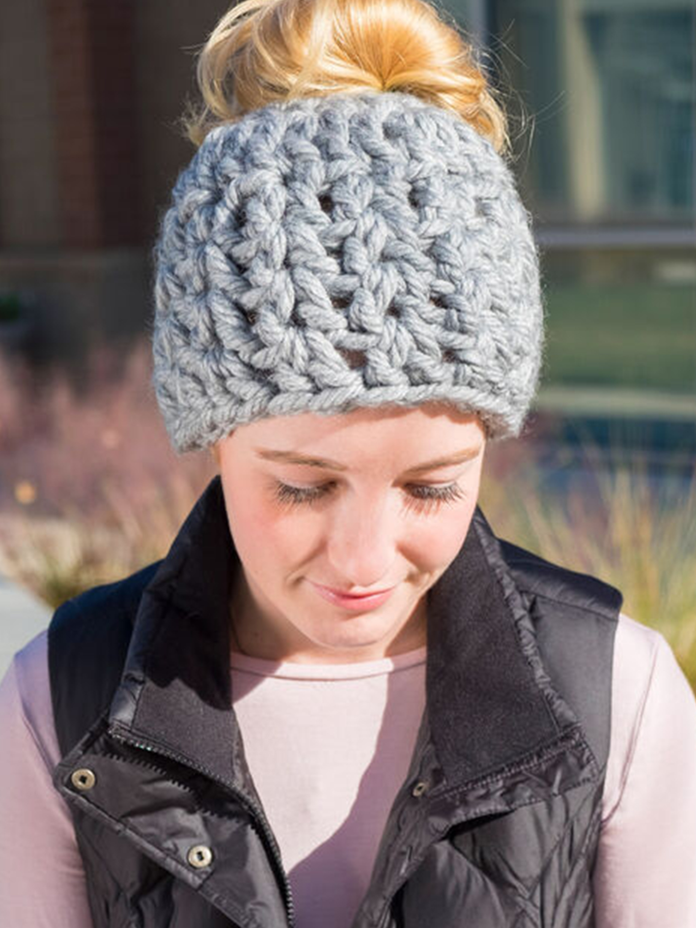 Using jumbo yarn and a big hook, crochet this bun hat in record time! Working around an elastic band, ponytail holder for the first round leaves a hole that allows your messy bun to stay outside the hat. Red Heart Grande makes it a fun first project, since it stitches up fast. And with so many color possibilities, it’s easy to make a personal statement of style!