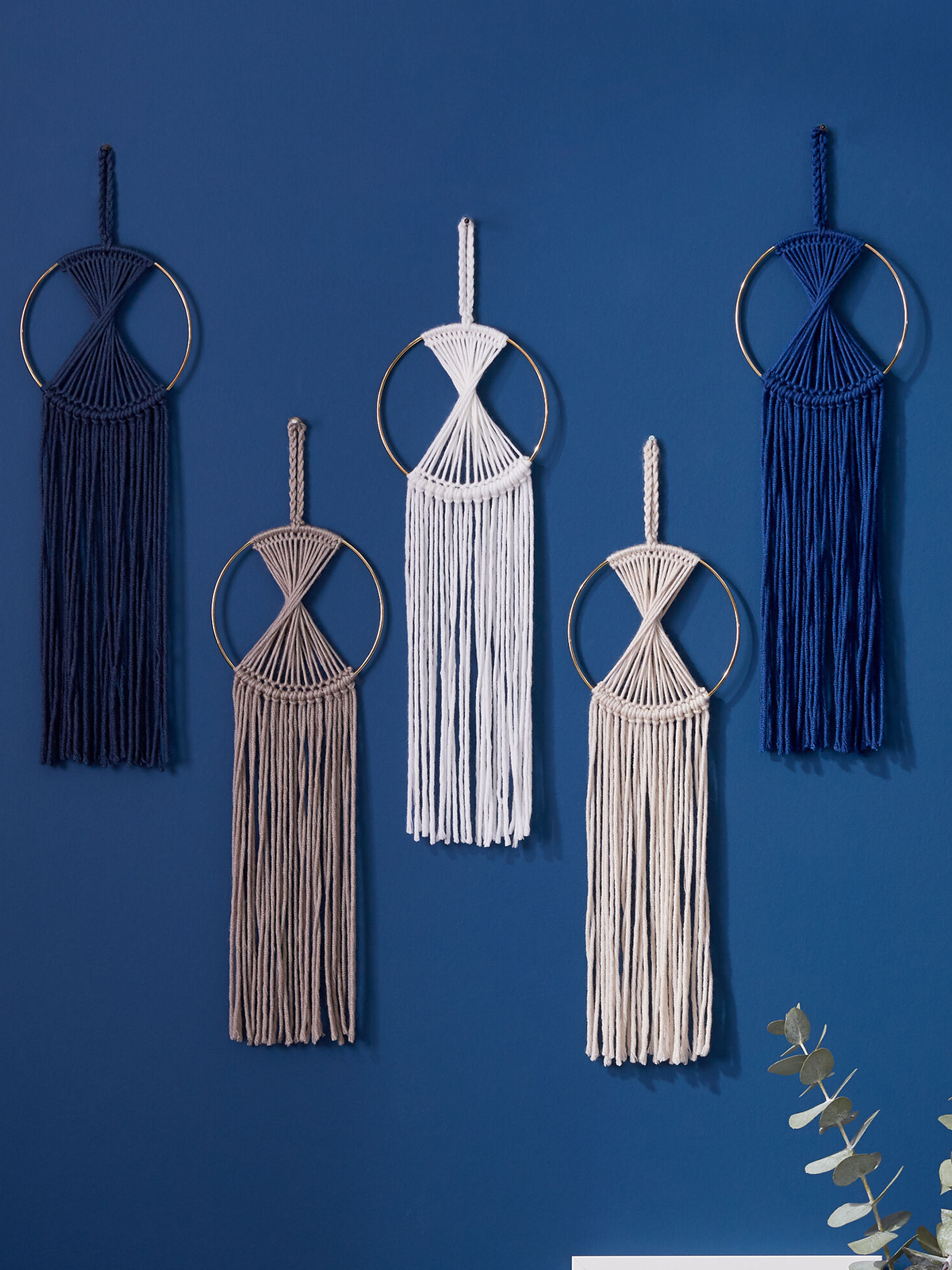 This set of five crochet wall hangings, made from one braid of Caron x Pantone yarn, makes a bold statement. The pattern uses single crochet around a brass hoop, simple weaving through the center, and applied fringe along the bottom. Expertly curated color palettes in each braid of Caron x Pantone yarn makes it easy to produce a stunning group of coordinating wall hangings.