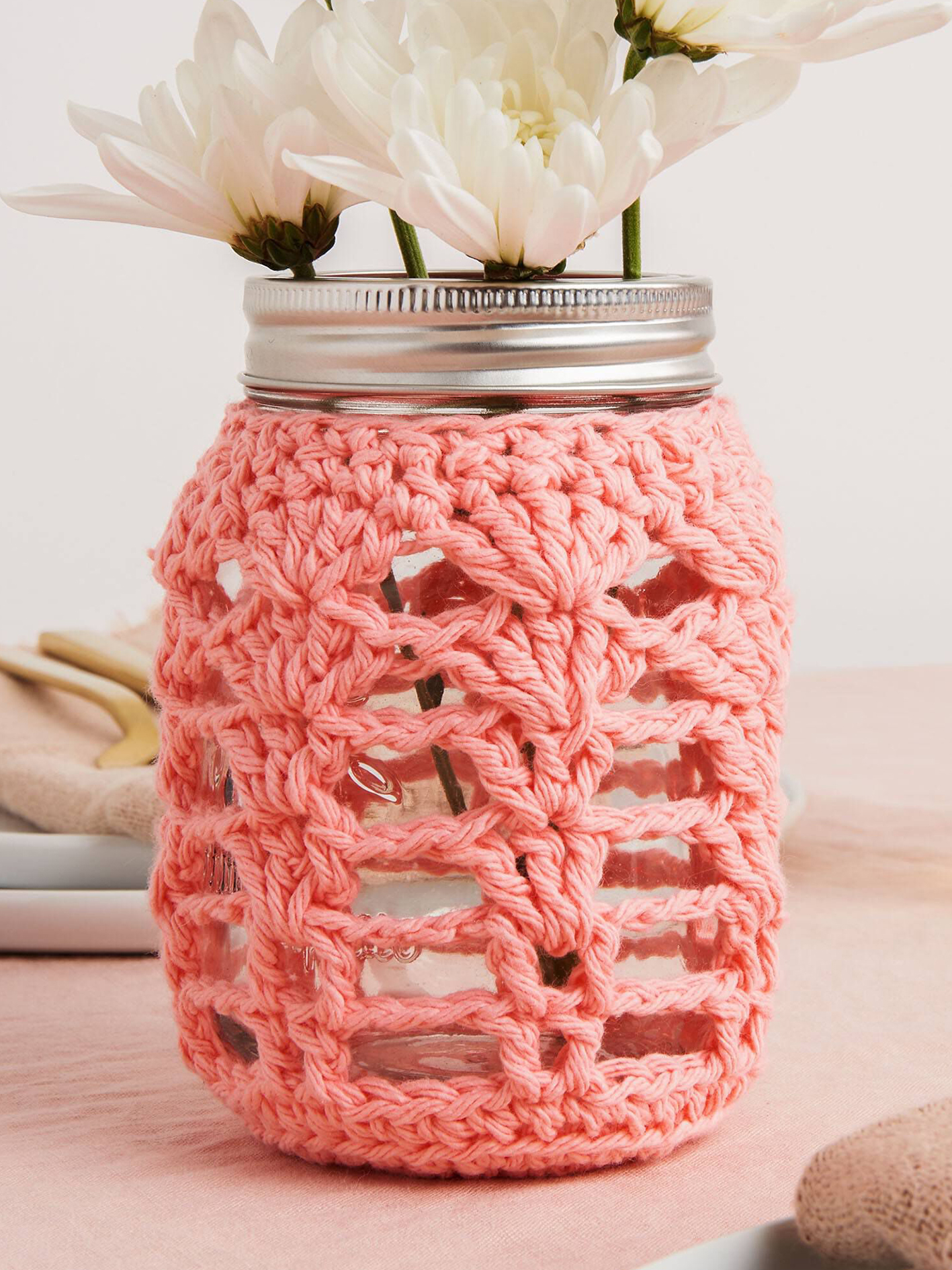 Decorate standard Mason jars with lacy crochet covers that turn them into accents you can use all over the house. Created in Lily Sugar’n Cream, they’re 100% cotton and you can customize using any colors that match your home. Make your covers using single crochet in the round for the base, plus an easy double crochet lace pattern for the sides. Then, fill them with fresh flowers, use them to hold utensils on the buffet table or even crochet hooks in your project room. The possibilities are endless so enjoy!