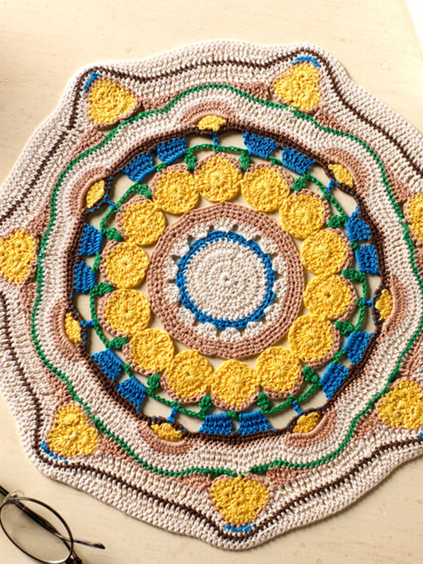 Many people and cultures have found meaning in the mandala, the circle with a center. This one has been beautifully designed with interesting crochet stitches so that you can take your own journey as you create it and then display it.