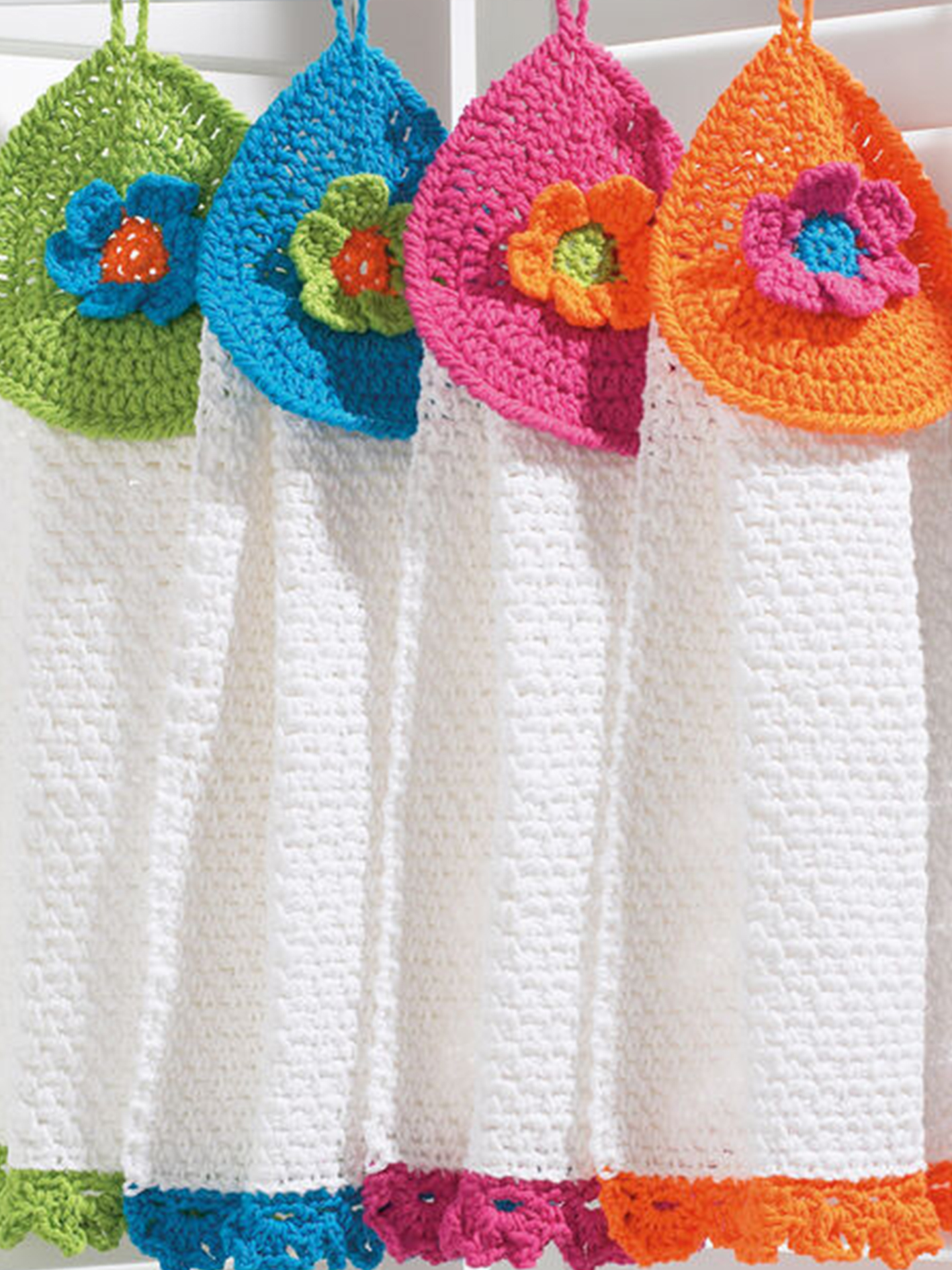 Thank goodness for easy-access tea towels in the kitchen! Craft these beautiful basics starting with white and the color contrasts shown in Bernat Handicrafter Cotton or, choose your own shades to contrast, and achieve the color scheme you prefer. Create a pretty set that enhances any kitchen’s functionality and look.
