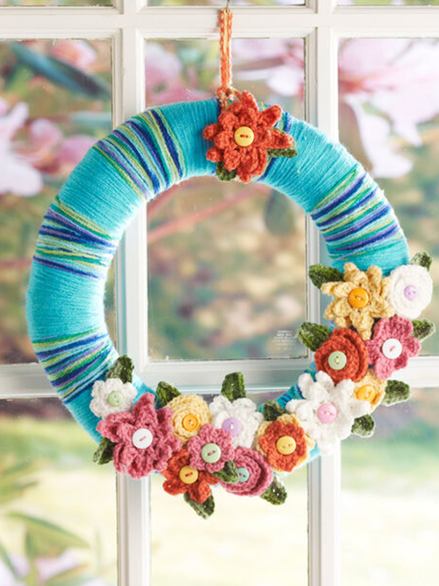Brighten up your front door or a kitchen window with this colorful wreath. Wreath form is simply wrapped with yarn. The leaves and flowers are crocheted and button centers add interest. Duplicate our wreath or use your own colors as desired.
