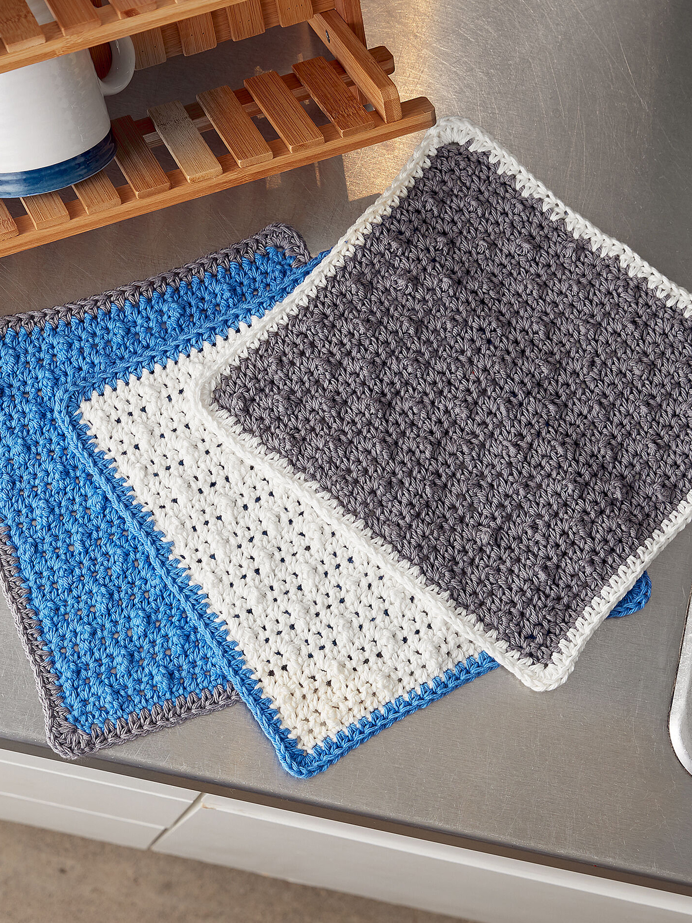 These absorbent 100% cotton dishcloths feature a textured crochet design with subtle bobbles. Choose three coordinating shades of Lily Sugar’n Cream to make a set. The worsted weight yarn is machine washable and dryable, and comes in a wide range of colors.