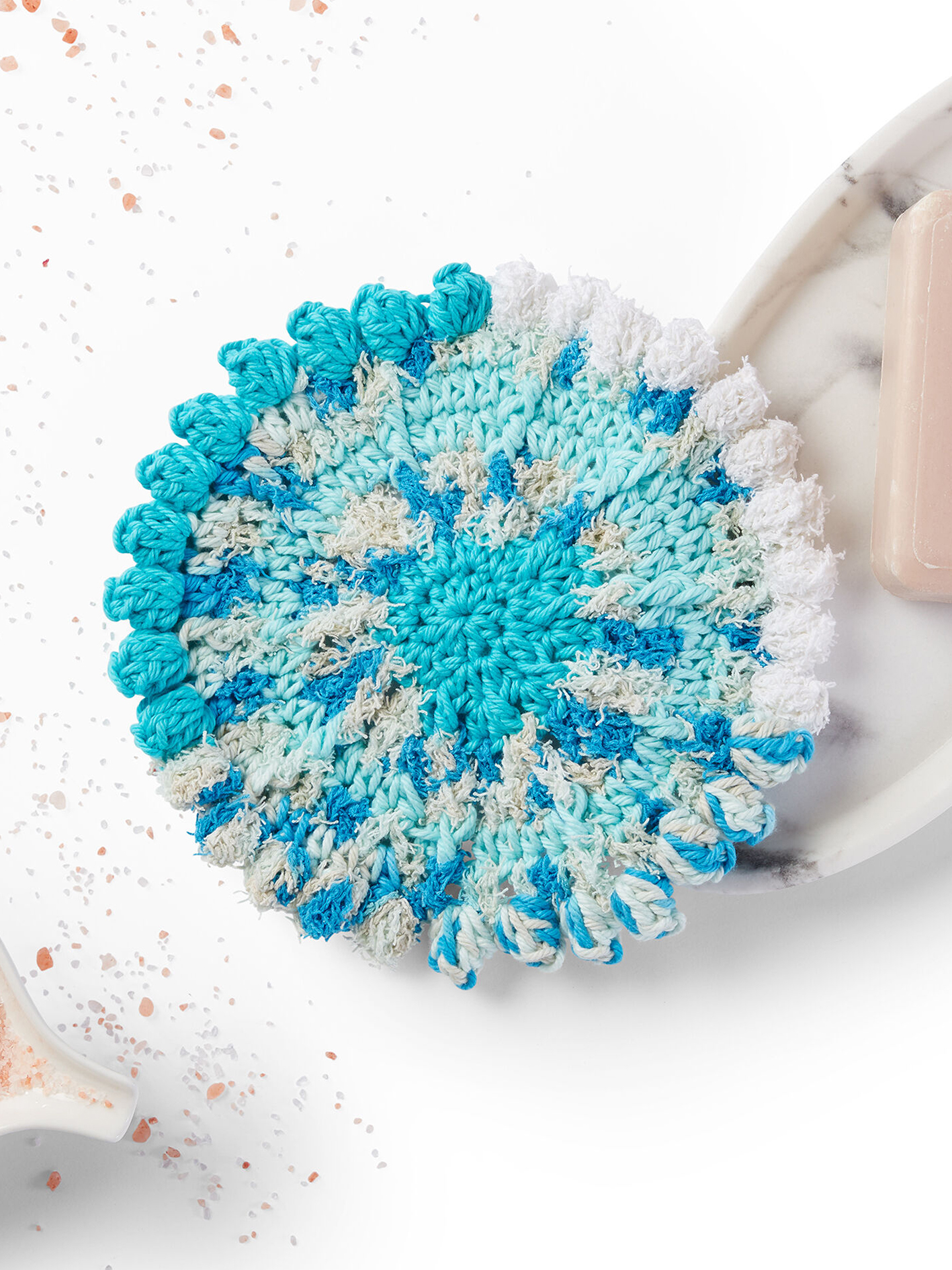 Have fun whipping up an adorable washcloth for the kitchen. This handy little helper is worked mainly in half double crochet, double crochet around the front post, and popcorn stitches to give it extra scrubbing power. Lily Sugar ‘n Cream Scrub Off is 100% cotton, with alternating sections of scouring texture, making it the perfect yarn for this lighthearted project.