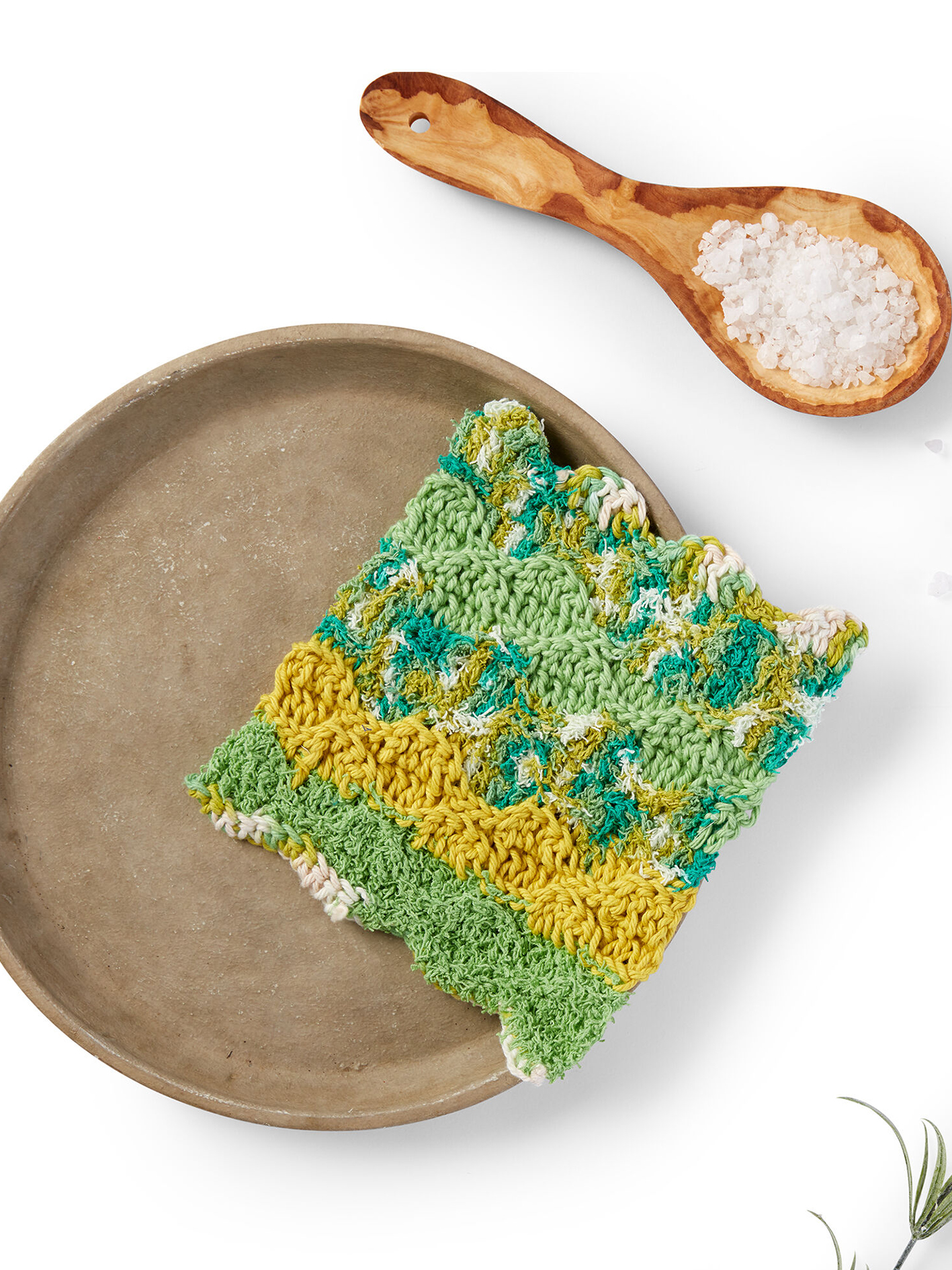 Create a fun, rippling texture using a combination of double and single crochet stitches to make this cute dishcloth. Lily Sugar’n Cream Scrub Off features alternating sections of scouring texture using the same 100% cotton yarn you know and love from Lily Sugar’n Cream. It’s perfect for tackling everyday clean-ups in a snap.