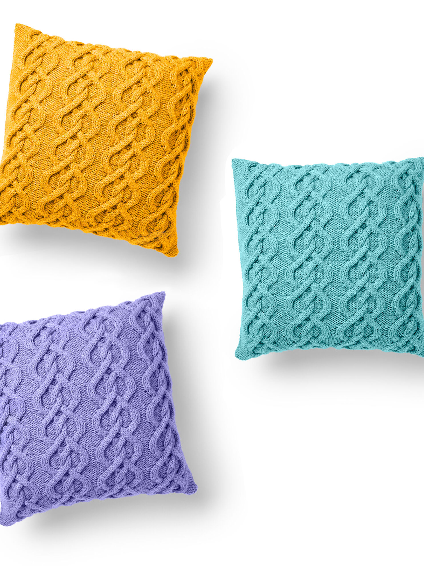 For the more seasoned crafter, elevate your skills with this beautiful knit pillow. As you work, a combination of knit and purl twists are revealed, forming an intimate pattern of textured cables. Stitch 4 similar cables positioned side-by-side, with 2 purl stitches in between to complete the final design. It’s a wonderful accent that adds a splash of color and texture to any interior setting.