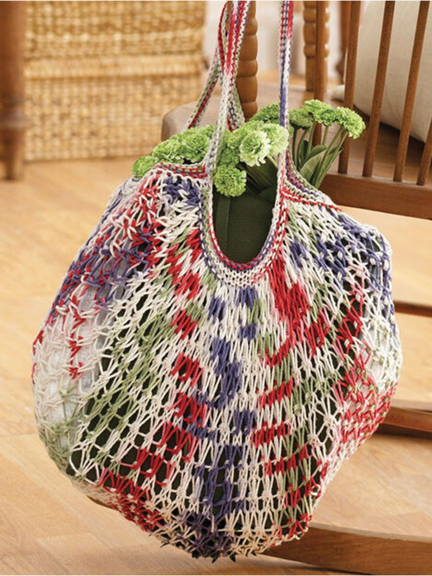 It’s compact to carry and versatile to use since it fits into your purse and expands on demand. Lily Sugar’n Cream makes this market bag durable and beautiful in any shade you enjoy from so many possibilities. Or, knit it as shown in fantastic Calico Ombre. Enjoy your trip to the market!