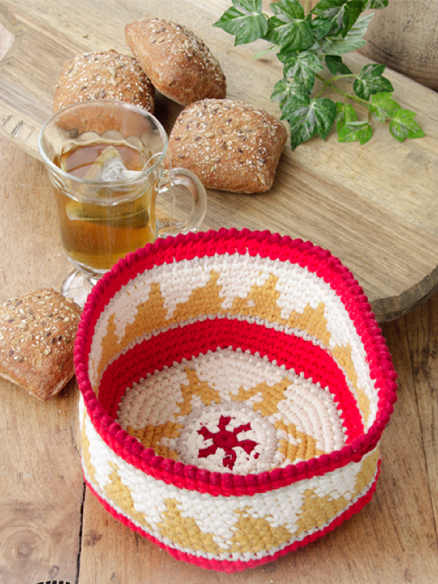 This lovely basket can be used as a bag, basket, or storage. It’s a lovely chevron or geometric pattern with nice thick braided yarn handles for carrying made easy.