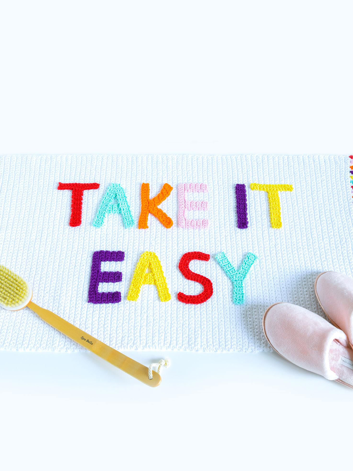 You’ll love waking up to this cheerful reminder to “Take it Easy” every morning! Stitched in Peaches & Creme, this crochet bath mat features vibrant shades that will brighten your whole day. A 100% cotton yarn makes this mat super absorbent and perfect for humid places like the bathroom. Pick up this easygoing pattern to practice single crochet, increases, decreases, fringe and assembly techniques. It’s a thoughtful gift for someone who could use this daily reminder!