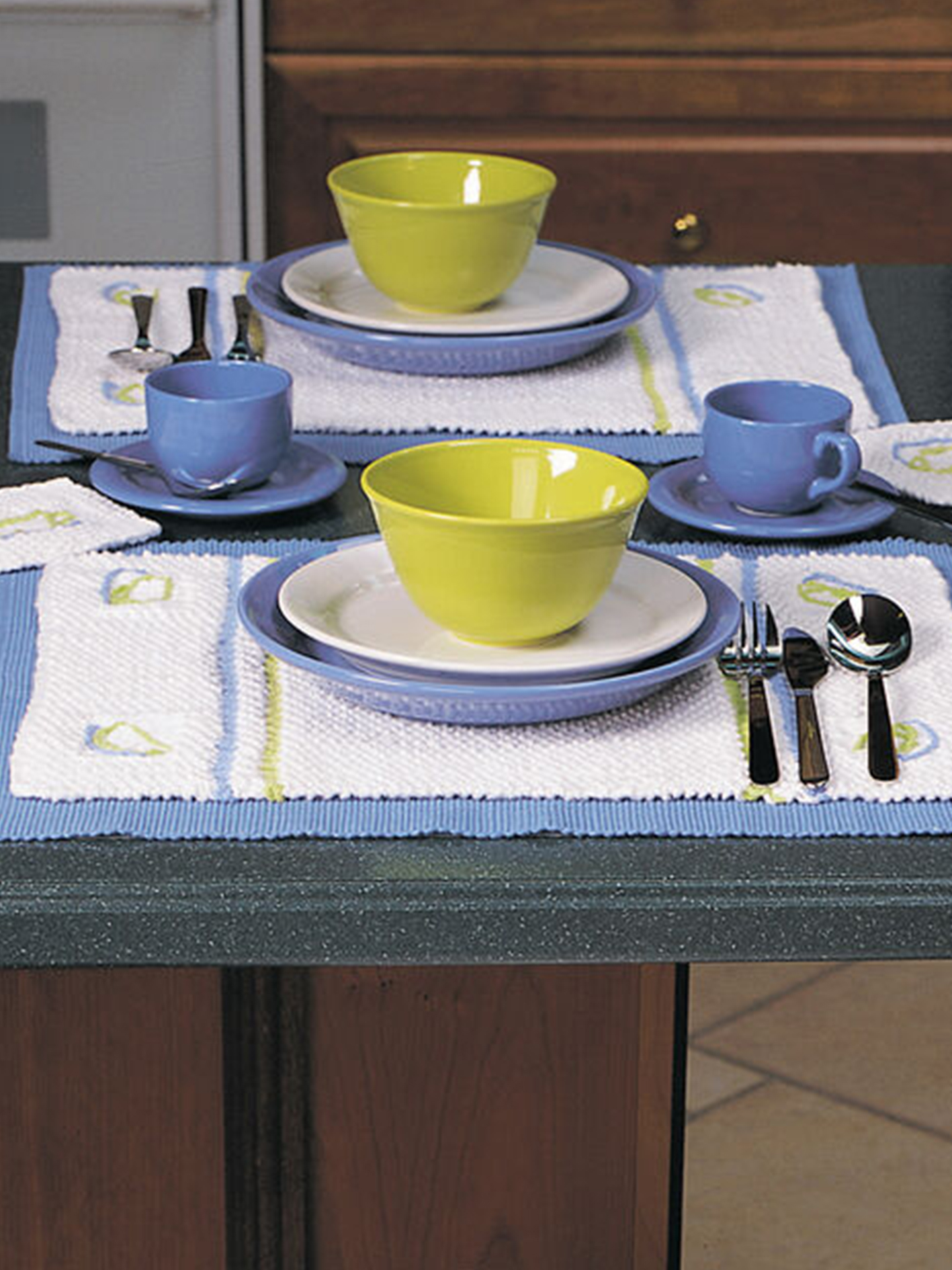 Knit these lighthearted table accessories for the tea lover in your world. Lily Sugar’n Cream makes these placemats and coasters simply adorable in the shades intended, or imagine a different set of colors to bring a customized interpretation to life. Make the table runner and chair pads to complete a lovely set to please any tea lover.